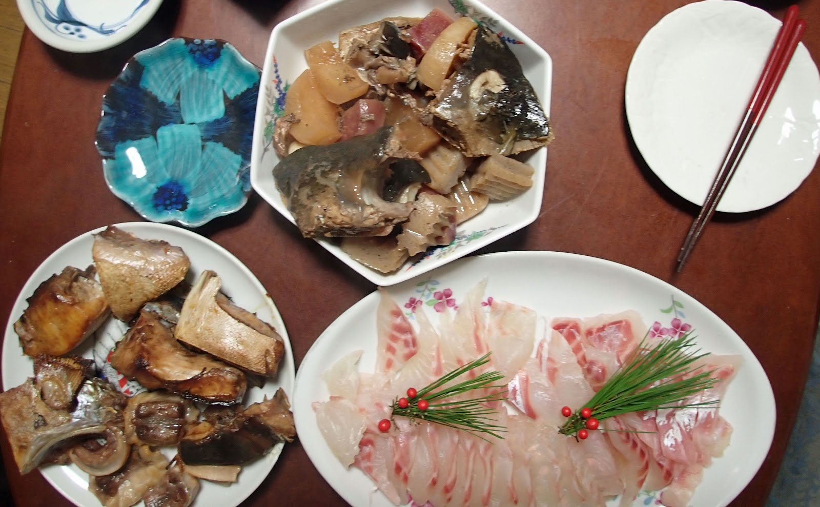 ブリの塩焼きとブリの煮物と鯛の刺身です。鯛の握り寿司です。