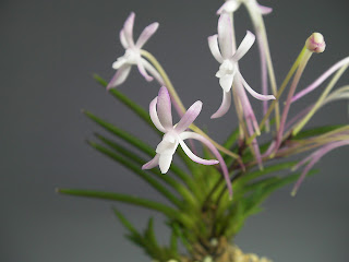 「高知県安田町産の針葉の紅花「安田姫(仮名)」を紹介します。この木は15年前に安田町の山取の風蘭を木に寄せて付けていたもののなかから細葉の立葉を入手していた。可愛いので安田姫(やすだひめ)と仮名を付けて楽しんでいます。